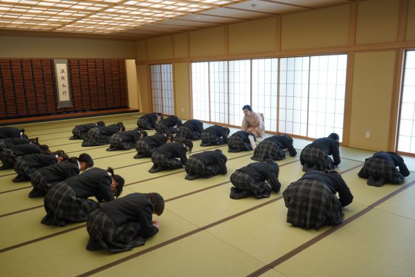 初めて講座を受ける1年生では、挨拶のしかたに種類があることや、正座をした時にしびれを取る方法などを教わりました。足がしびれた生徒たちが試してみると、本当にしびれが取れて驚いている様子も見られました。