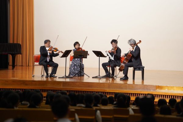 松本講堂では「NHK 交響楽団 弦楽トップメンバーによるポピュラーと名曲コンサート」が行われました。音楽の授業でも親しみのあるクラシックの名曲や、生徒たちに親しみのある楽曲などを臨場感あふれる演奏で楽しみながら聞き入りました。曲の合間には楽器の説明や曲に関する知識などもお話しいただきました。