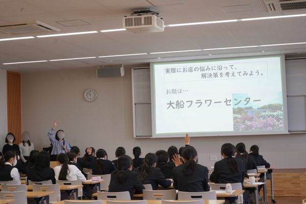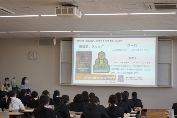 12月16日(火)、中等部3年生を対象に、鎌倉学習プログラムの一環として鎌倉女子大学との高大連携企画を行いました。前半は鎌倉女子大学クルッポ部の学生から、鎌倉市のみ利用できるコミュニティ通貨(クルッポ)について説明を受け、クルッポの活用が地域貢献につながることを知りました。後半は大船フラワーセンターにおける知名度向上や新規客層に向けたアイデアなどを数名のグループに分かれて提案し合いました。今回の活動を通して、生徒にとって身近な地域である鎌倉に対する興味や関心を深めることができました。