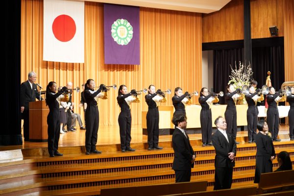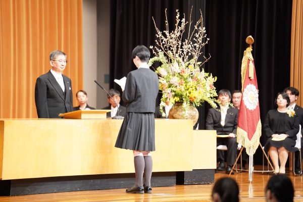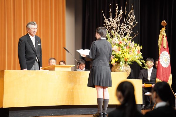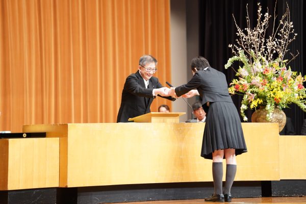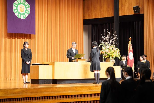 開式に先立ち、フェアリーコンソート部による幕前演奏が披露され、その後、修養の鐘を合図に式がスタートしました。卒業証書授与では、一人ひとりの名前が呼ばれ、代表生徒が壇上で証書を受け取りました。続いて、学園長先生・部長(校長)先生より式辞が述べられ、各種賞の授与も行われました。そして、在校生代表による送辞と卒業生代表による答辞、記念品の贈呈と式は進み、式の終盤にはマーチングバンド部の演奏に見送られながら卒業生が退場しました。
